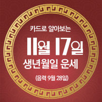 [카드뉴스로 읽는 오늘의 운세] 11월 17일 (월요일) 춘강 구박사가 알려주는 생년월일 금전운은? 생년월일 오늘의 운세 --- 2025년 11월 17일(음력 9월 28일) 庚寅 월요일 순국선열의 날 子쥐 띠 晴天雷聲格(청천뢰성격)으로 맑은 하늘에서 천둥 번개가 쳐서..