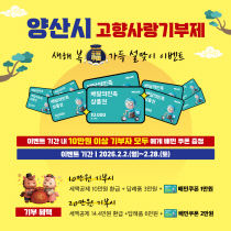 양산시가 설 명절을 맞아 고향사랑기부제 참여를 독려하기 위해 2월 2일부터 28일까지 한 달간 '새해 복(福) 가득 설맞이 이벤트'를 진행한다. 이번 이벤트는 기간 내 양산시에 고향사랑기부를 실천한 시민들을 대상으로 한다. 10만 원 이상 기부자에게는 배달앱 쿠폰 1만..
