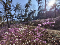 청양군 우산 산림조경 숲 산책로에 진달래가 만개하며 봄 정취를 더하고 있다. 3일 군에 따르면 우산 일대는 소나무 군락이 잘 형성돼 사계절 푸른 경관을 유지하는 곳으로 소나무 아래에서 자라는 진달래가 자연스럽게 어우러진다. 군은 2022년부터 경관 조림 사업으로 소나무..