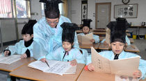 5일 대전 유성구 진잠향교에서 열린 충효예 교실에서 방학을 맞은 학생들이 훈장님으로부터 사자소학을 배우고 있다. 이성희 기자 token77@