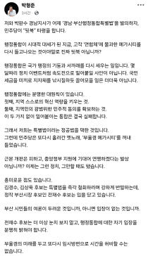 박형준 부산시장이 '경남·부산 행정통합 특별법' 발의를 비판하는 더불어민주당을 향해 시대착오적인 공세라며 강하게 반박하고 나섰다. 박 시장은 15일 자신의 사회관계망서비스(SNS)를 통해 "행정통합이 시대적 대세가 된 지금, 고작 '연합체'에 불과한 메가시티를 다시 들..