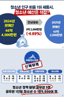 '청소년 인구 최다' 지표를 자랑하는 세종시가 정작 청소년 예산 지원은 물론 전담 인력조차 턱없이 부족한 것으로 나타났다. 아동에 이어 청소년 예산까지 감축된 흐름 속에 인력·자원의 재배치와 공공시설 확충을 통해 지역 미래 세대를 위한 전사적 지원의 필요성이 제기되고..