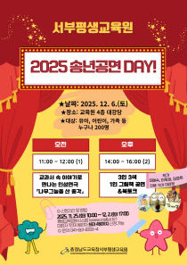 충청남도교육청 서부평생교육원(원장 조권호)은 오는 12월 6일 교육원 4층 대강당에서 지역주민을 대상으로 「2025년 송년공연」을 개최한다고 밝혔다. 이번 공연은 유아와 저학년 어린이, 가족, 그림책을 사랑하는 누구나 참여 가능하며, 회차별 약 200명 규모로 운영된다..