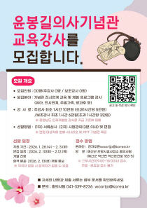예산군 관광시설사업소는 2026년 윤봉길의사기념관 교육 프로그램을 함께 운영할 교육 강사를 공개 모집한다고 20일 밝혔다. 이번 모집은 주강사와 보조강사로 나눠 진행되며, 선발된 강사는 유아 대상 교육 프로그램을 비롯해 전시 연계 교육, 주말 가족 체험, 방과 후 활동..
