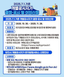 당진시(시장 오성환)는 10월 29일 2025년 상반기 토지이동을 완료한 3143필지의 7월 1일 기준 개별공시지가를 10월 30일 결정·공시하고 11월 28일까지 30일간 이의신청을 접수한다고 밝혔다. 시에 따르면 결정·공시한 개별공시지가는 감정평가사의 검증과 토지소..