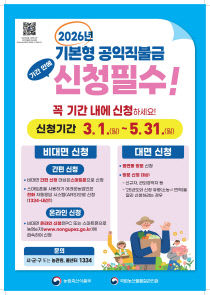 공주시는 3월 1일부터 '2026년 기본형 공익직불금' 신청을 받는다고 27일 밝혔다. 기본형 공익직불금은 농업 활동을 통해 식품 안전과 환경 보전, 농촌 유지 등 공익적 기능을 수행하는 농업인과 농업법인의 소득 안정을 지원하는 보조금 제도다. 농업경영정보를 등록한 농..