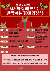 김포시 풍무도서관에서 초등학생을 대상으로 '사서와 함께 만드는 반짝이는 3D트리장식'을 12월 10일 오후 4시부터 6시까지 운영한다. 이번 프로그램은 수강생의 학년에 따라 제작 도구의 난이도와 창작물이 구분되며, 참여 학생의 수준에 맞춘 맞춤형 체험활동으로 운영된다...