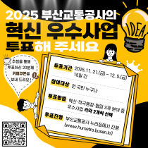 부산교통공사가 올해 추진한 혁신·적극행정·협업 우수사업에 대한 시민 투표를 다음 달 5일까지 진행한다. 부산교통공사는 올해 추진한 사업 성과를 시민과 함께 평가하기 위해 '2025년 혁신·적극행정·협업 우수사업 시민 투표'를 12월 5일까지 진행한다고 밝혔다. 공사는..