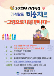 부산구덕도서관이 게슈탈트 미술치료를 통해 지역 주민의 정서 치유와 심리 안정을 돕는다. 부산시립구덕도서관은 오는 26일부터 다음 달 17일까지 매주 수요일 도서관 문화강좌실에서 지역주민 15명을 대상으로 건강특강 '게슈탈트 미술치료, 그림으로 나를 만나다' 프로그램을..