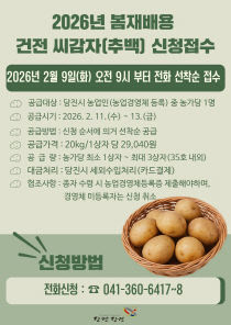 당진시(시장 오성환)는 2월 3일 봄 재배용으로 활용할 조직배양 '추백' 씨감자 원종 2t을 관내 농가에 공급하기 위해 9일 오전 9시부터 선착순으로 신청을 받는다고 밝혔다. 이번에 공급하는 '추백' 씨감자는 충청남도 스마트농업본부에서 조직배양으로 생산한 원원종을 분양..