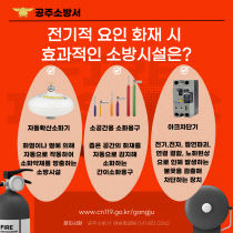 공주소방서(서장 오긍환)는 최근 부산 호텔 화재 등 전기적 요인에 의한 화재가 잇따라 발생함에 따라, 초기 화재 확산을 방지할 수 있는 자동확산소화기, 소공간용 소화용구, 아크차단기 설치의 중요성을 적극 홍보하고 나섰다. 전기화재는 배선 노후화, 과부하, 접촉 불량 등..