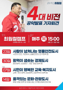 최원철 공주시장 후보가 공주의 미래 청사진을 담은 '4대 비전 공약'을 정례 기자회견을 통해 순차적으로 발표한다. 최 후보는 민선 8기 성과를 토대로 향후 공주 발전 방향과 구체적인 실행 방안을 시민들에게 직접 설명하기 위해 매주 목요일 정례 브리핑을 개최할 계획이라고..