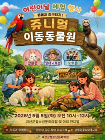 괴산군이 어린이날인 5월 5일 청소년문화의집에서 온 가족이 함께 즐길 수 있는 참여형 생태체험 프로그램 쥬니멀 이동동물원을 운영한다. 이날 행사는 오전 10시부터 낮 12시까지 문화의집과 야외 잔디밭에서 동물 관찰존, 생태교육존, 포토존 등 다양한 체험공간이 운영된다...