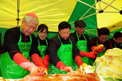 특히 행사 마지막날인 29일에는 유흥식 주교를 비롯한 교구 사제단과 수도자, 허태정 유성구청장, 노은동농수산물시장 내 후원 업체인 송미나 대전중앙청과(주) 사장과 중도매인, 대전원예농협, 매년 김장에 필요한 젓갈을 후원해 온 강경군산젓갈상회 김미경씨와 후원자들이 참여해 김장 김치를 담그며 나눔을 실천했다.