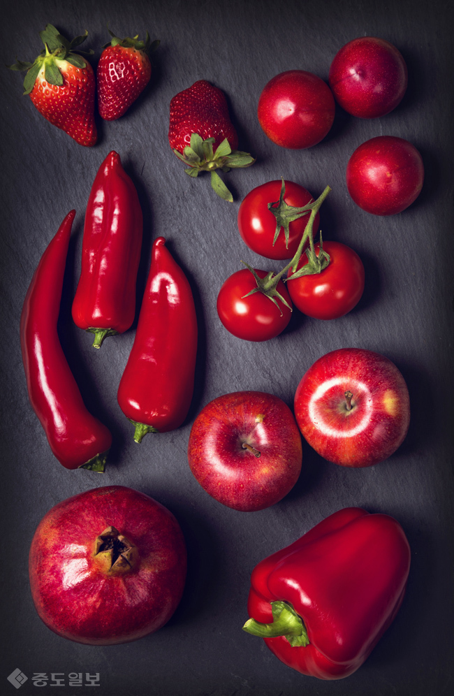 대표과일:비츠,체리,레드자몽,석류,라즈베리,사과,빨간파프리카,빨간포도,빨간양파,딸기,토마토,수박 빨간고추,칠리고추 등.