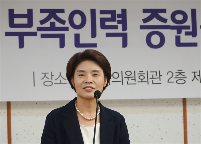 (서울=연합뉴스) 백승렬 기자 = 더불어민주당 한정애 의원이 24일 오후 국회 의원회관에서 `집배원 과로사 무엇이 문제인가?' 주제로 열린 `집배원 과로사 근절 대책 및 부족인력 증원을 위한 토론회'에서 축사하고 있다. 2017.7.24