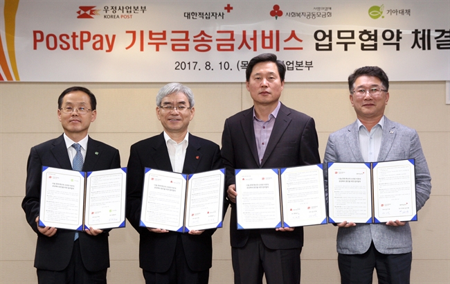 (서울=연합뉴스) 10일 오후 서울 광화문우체국에서 열린 '포스트페이 기부금 송금서비스를 위한 업무 협약식'에서 서경석 기아대책 부회장(왼쪽부터), 박찬봉 사회복지공동모금회 사무총장, 김기덕 우정사업본부장, 김건중 대한적십자사 사무총장이 MOU를 체결하고 있다. 2017.8.10 [우정사업본부 제공=연합뉴스]
