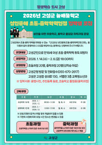 경남 고성군은 학력 취득을 희망하는 성인 학습자를 대상으로 '고성군 늘배움학교' 2026학년도 입학생을 모집한다. 고성군 늘배움학교는 2023년부터 운영 중인 초등학력 인정 문해교육 프로그램이다. 경남도교육청 지정을 받아 고성군이 직접 운영한다. 수강료는 전액 무료다...