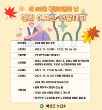 예산군보건소는 '제80회 구강보건의 날'을 맞아 건강하고 활기찬 구강생활 실천 분위기 조성을 위해 건치(건강한 치아)어르신 선발대회를 개최한다고 14일 밝혔다. 건치어르신 선발대회는 구강 건강관리를 잘해 건강한 자연치아를 20개 이상 보유하고 건강한 잇몸 상태를 가진..