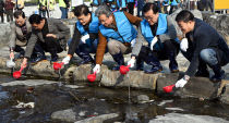 21일 대전 유성구청 앞 유성천변에서 열린 2026년 세계 물의 날 기념 하천 정화 및 탄소중립 캠페인에서 정용래 구청장을 비롯한 내빈과 참가자들이 동자개 등 토종물고기 치어 2만 마리를 방류하고 있다. 이성희 기자 token77@