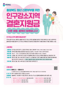 괴산군이 인구감소지역 결혼지원금 사업을 본격 추진한다고 5일 밝혔다. 이 사업은 혼인 건수가 계속해서 감소하고 있는 인구감소지역의 결혼을 장려하고 청년 세대의 안정적인 지역 정착을 유도하기 위한 지원이다. 지원 대상은 올 1월 1일부터 12월 11일까지 혼인신고를 마친..