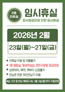 서천도서관(관장 김남희)이 소장 자료의 정확한 관리와 이용 환경 개선을 위해 23일부터 27일까지 2층 자료실을 임시 휴실한다. 이번 임시 휴실은 정기 장서 점검에 따른 조치로 도서관 소장 자료와 전산 자료를 대조해 자료 소재를 확인하고 오·배열 자료 및 훼손 도서 정..