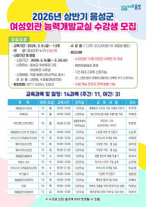 음성군이 2026년 상반기 여성회관 능력개발교실 수강생을 모집한다. 이번 교육은 3월 6일부터 12주간 진행되며 ▲재봉틀반 ▲라인댄스 ▲라떼아트 ▲바리스타자격증반 ▲떡 만들기 ▲헤어커트 ▲프랑스 자수 ▲민화 등 주·야간 총 14강좌로 구성됐다. 접수는 2월 9일부터 2..