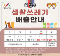충남 서산시가 설 명절을 맞아 귀성객과 시민들이 쾌적한 환경에서 연휴를 보낼 수 있도록 2월 2일부터 18일까지 '설 명절 쓰레기 관리 대책'을 추진한다. 이번 대책은 명절 전 도시 환경 정비부터 연휴 기간 생활 쓰레기 수거 공백 관리, 긴급 민원 대응 체계 운영까지..