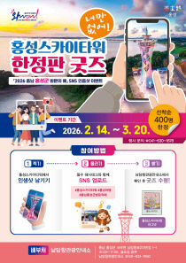 홍성군이 누적 방문객 34만 명을 돌파한 홍성스카이타워를 활용해 대규모 소셜미디어 인증 이벤트를 전개한다고 10일 밝혔다. 홍성군은 2026년 '충남 홍성군 방문의 해'를 앞두고 3월 20일까지 한정판 기념품 증정 이벤트를 진행한다. 이번 이벤트는 '찍으면 바로 인생샷..
