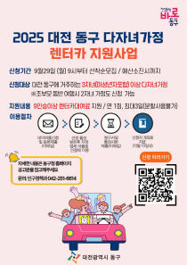 대전 동구는 다자녀 가정의 여가활동 지원과 아이 키우기 좋은 환경 조성을 위해 '2025년 다자녀 가정 렌터카 지원사업'을 본격 추진, 이달 29일부터 참여자를 모집한다고 밝혔다. 23일 동구에 따르면 이번 사업은 총 2천만 원의 고향사랑기금으로 추진되며, 신청 대상은..