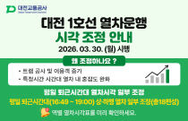대전교통공사는 오는 30일부터 평일 퇴근 시간대 도시철도 1호선 열차 운행 시각을 일부 조정한다고 16일 밝혔다. 이번 조정은 시민의 발인 대전도시철도가 시민 생활과 밀접한 교통수단인 만큼, 최근 시민들의 유류비 부담 가중과 도시철도 2호선 트램 전 구간 착공에 따른..