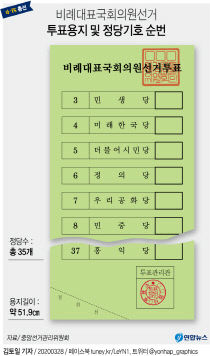 21대 총선 비례투표지에는 가장 윗 칸부터 민생당, 미래한국당, 더불어시민당, 정의당 순으로 기재된다. 국민의당은 8번째, 열린민주당은 10번째 칸이며 충청의미래당(기호 34번)은 가장 밑에서 네 번째 칸에 배정됐다. 지역구 투표용지에선 민주당은 첫 칸이며 미래통합당은..