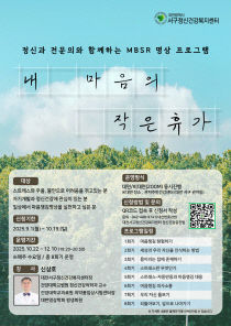 대전 서구정신건강복지센터(센터장 신상호)는 시민들의 스트레스완화와 정신건강증진을 위해 정신과전문의와 함께하는 명상 프로그램 '내 마음의 작은 휴가'참여자를 이번 달부터 10월 19일까지 모집한다. MBSR(마음챙김에 기반한 스트레스 감소)은 마음챙김을 바탕으로 스트레스..