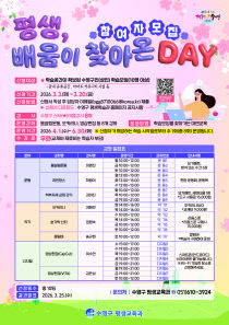 부산시 수영구가 학습자가 원하는 장소로 마을강사가 직접 찾아가 강좌를 운영하는 '평생, 배움이 찾아온 DAY' 사업의 상반기 참여 모임을 모집한다. 이번 사업은 기존 '찾아가는 늘 배움 강좌'의 불편함을 보완해 신청자의 강사 및 주제 선택 부담을 줄이고 생활권 내 평생..