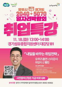 양주시가 오는 18일 경기섬유종합지원센터에서 열리는 2025 양주시&경기도 2040+5070 통합 일자리박람회에서 취업 전문가 황인 강사의 특별 강연을 진행한다. 이번 강연은 오후 1시부터 '내일을 바꾸는 취업전략'을 주제로 열리며, 구직자들에게 실질적이고 현실적인 취..