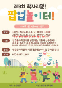 영월군 가족센터가 11월 14일과 15일, 지역 어린이와 가족을 위한 체험형 놀이 축제 '제3회 왁자지껄 팝업 놀이터'를 운영한다. 이번 행사는 지난 6월과 9월에 이어 올해 세 번째로 열리며, 매회 1000명 이상의 지역 주민과 어린이들이 참여할 만큼 큰 호응을 얻고..