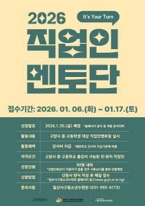 고양시청소년재단 일산서구청소년수련관이 청소년들의 진로 탐색·설계를 지원하기 위한 '2026 직업인멘토단'을 모집한다고 밝혔다. 고양시 직업인멘토단은 다양한 분야에서 활동 중인 전현직 직업인이 학교를 직접 방문해 자신의 직업 경험과 생생한 현장 이야기를 전하는 고양시 대..