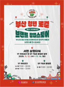 부산시가 서면 삼정타워에서 청년 로컬 브랜드의 매력을 알리는 팝업스토어를 개최한다. 부산시와 부산경제진흥원은 12일부터 16일까지 5일간 서면 삼정타워에서 '2025 부산 청년 로컬 브랜드 팝업스토어'를 개최한다고 밝혔다. 이번 행사는 '청년 로컬크리에이터 레벨업 사업..