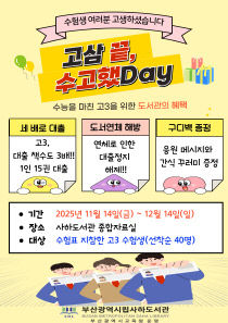 부산사하도서관이 수능을 마친 고3 수험생을 응원하는 특별행사를 운영한다. 부산시립사하도서관은 오는 14일부터 다음 달 14일까지 사하도서관에서 대학수학능력시험을 마친 고3 수험생 40명을 대상으로 '고삼 끝, 수고했Day' 행사를 운영한다고 밝혔다. 이번 행사는 수능을..
