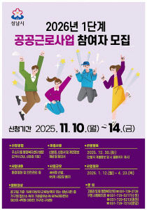 성남시(시장 신상진)는 시민에게 한시적인 일자리를 제공하기 위해 10일부터 14일까지 '2026년도 1단계 공공근로사업' 참여 희망자 465명을 모집한다고 3일 밝혔다. 참여자는 내년 1월 12일부터 4월 23일까지 약 4개월간 시민농원, 폐기물처리시설, 동 행정복지센..