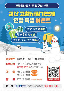 경산시는 11월 19일부터 12월 25일까지 고향사랑기부제 연말 특별 이벤트를 진행한다. 이번 행사는 고향사랑기부금에 대한 관심이 집중되는 연말에 특별 이벤트를 통해 고향사랑기부제의 활성화를 도모하기 위해 진행된다. 이벤트 대상은 기간 중 경산시에 고향사랑기부금을 10..