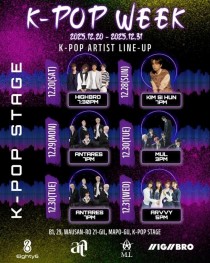 '케이팝스테이지'가 2025년 마지막을 'K팝 위크'로 장식한다.종합콘텐츠제작사 윤소그룹이 주관하는 'K팝 위크'는 지난 20일부터 오는 31일까지 서울 마포구 홍대 '케이팝스테이지'에서 펼쳐지고 있다. 앞서 지난 20일에는 하이브로, 28일에는 김시훈이 'K팝 위크'..