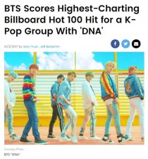 미국 빌보드가 2일(현지시간) 방탄소년단이 'DNA'로 빌보드 '핫100'에서 K팝 그룹 최고 순위를 기록했다는 제목의 칼럼에서 "'DNA'는 2주 만에 85위에서 67위로 순위가 상승했다"며 "1주일 전 '핫 100'에 처음 등장한 뒤 이번 주는 67위로 급등하며 K..