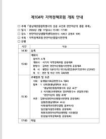“귀하를 지역정책포럼에 정중히 초대합니다.” 제104차 지역정책포럼이 ‘충남대전통합특별시의 성공 요건과 천안·아산의 통합 과제’를 제목으로 2월11일 오후 3시부터 5시까지 천안아산상생협력센터 다목적실에서 열린다. 지역정책포럼(공동대표 한성일 중도일보 이사, 유병선 대..