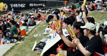 7일 안전공업 손주환 대표와 상무 등 임직원들이 화재 희생자 합동분향소가 이전한 문평공원을 찾아오자 유가족들이 반발하며 손 대표를 쫓아내고 있다. 이성희 기자 token77@