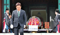 22일 대전 서구 보라매공원에서 열린 요가 페스티벌에서 참가자들과 서철모 서구청장이 강사의 동작을 따라하고 있다. 이성희 기자