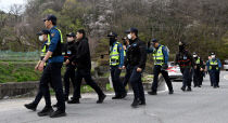 대전오월드를 탈출한 늑대 ‘늑구’가 오월드 인근 야산에서 목격된 가운데 14일 경찰들이 포획을 위해 중구 무수동의 한 야산으로 들어가고 있다. 이성희 기자