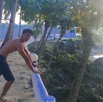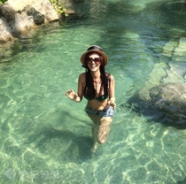 그는 공개된 사진 속 맑은 물가에 들어가 해맑은 얼굴로 카메라를 응시하고 있다.