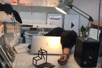 사진 속에서는 한 남성이 노트북에 기대어 잠을 청하고 있는 모습이다.