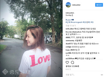 사진 속에는 핑크색 알파벳으로 Love라는 글자가 큼지막하게 프린트 된 흰색 티셔츠를 입고 산책을 하고 있는 모습이 담겨있다. 고개를 살짝 돌려..
